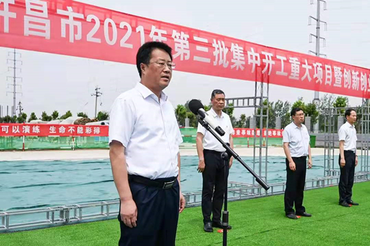 中航建设集团河南分公司总经理黄辰在致辞中表示,感谢许昌市各级党委政府给予的殷切关怀和帮助扶持,作为许昌市2021年第三批集中开工重大项目之一,许昌中航创新创业示范基地二期项目正式开工,标志着双方开启了合作新篇章,这既是一份信任,也是一种责任。中航建设人将以高度的责任心与使命感,坚持效率和质量并行,确保重点工程建设安全有序推进,努力把项目建设成高质量的标杆工程,为推进许昌市“智造之都、宜居之城”建设,打造现代化新魏都增色添彩、贡献力量。